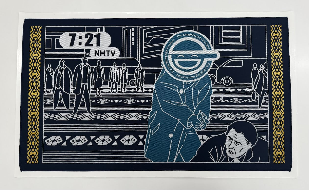 攻殻機動隊 STAND ALONE COMPLEXを象徴する「笑い男マーク」が、博多織の黄色い献上柄のフレームに包まれました。